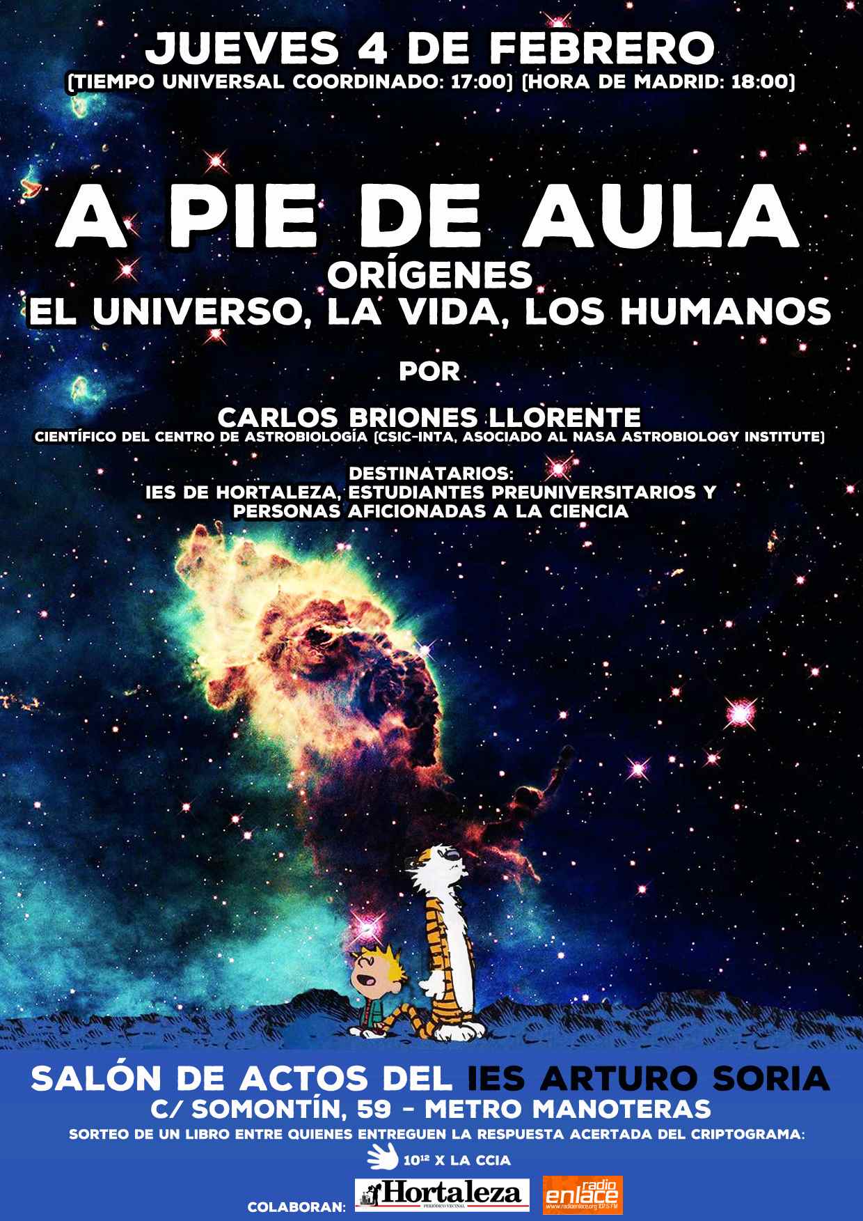 El jueves 4 de febrero, a las 18 horas, el instituto Arturo Soria (C/ Somontín, 59 Metro Manoteras) acoge la charla 'Orígenes, el universo, la vida y los humanos' que impartirá Carlos Briones Llorente, científico del centro de astrobiología CSIC-INTA, asociado al NASA Astrobiology Institute. La entrada es libre y gratuita.