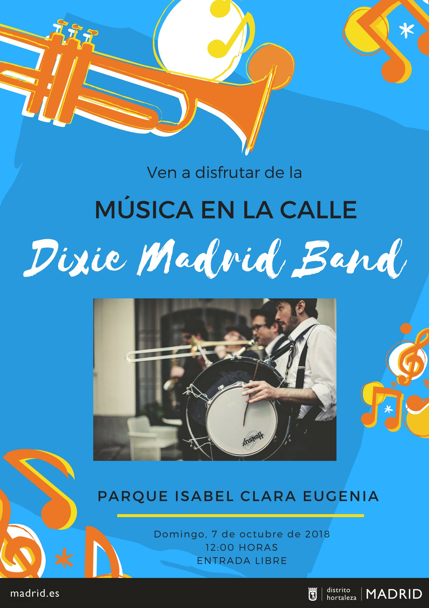 El domingo 7 de octubre a las 12.00 horas, vuelve la música a las calles del distrito, esta vez, en el parque Isabel Clara Eugenia (Valdetorres de Jarama, 1) con el jazz de Dixie Madrid Band.