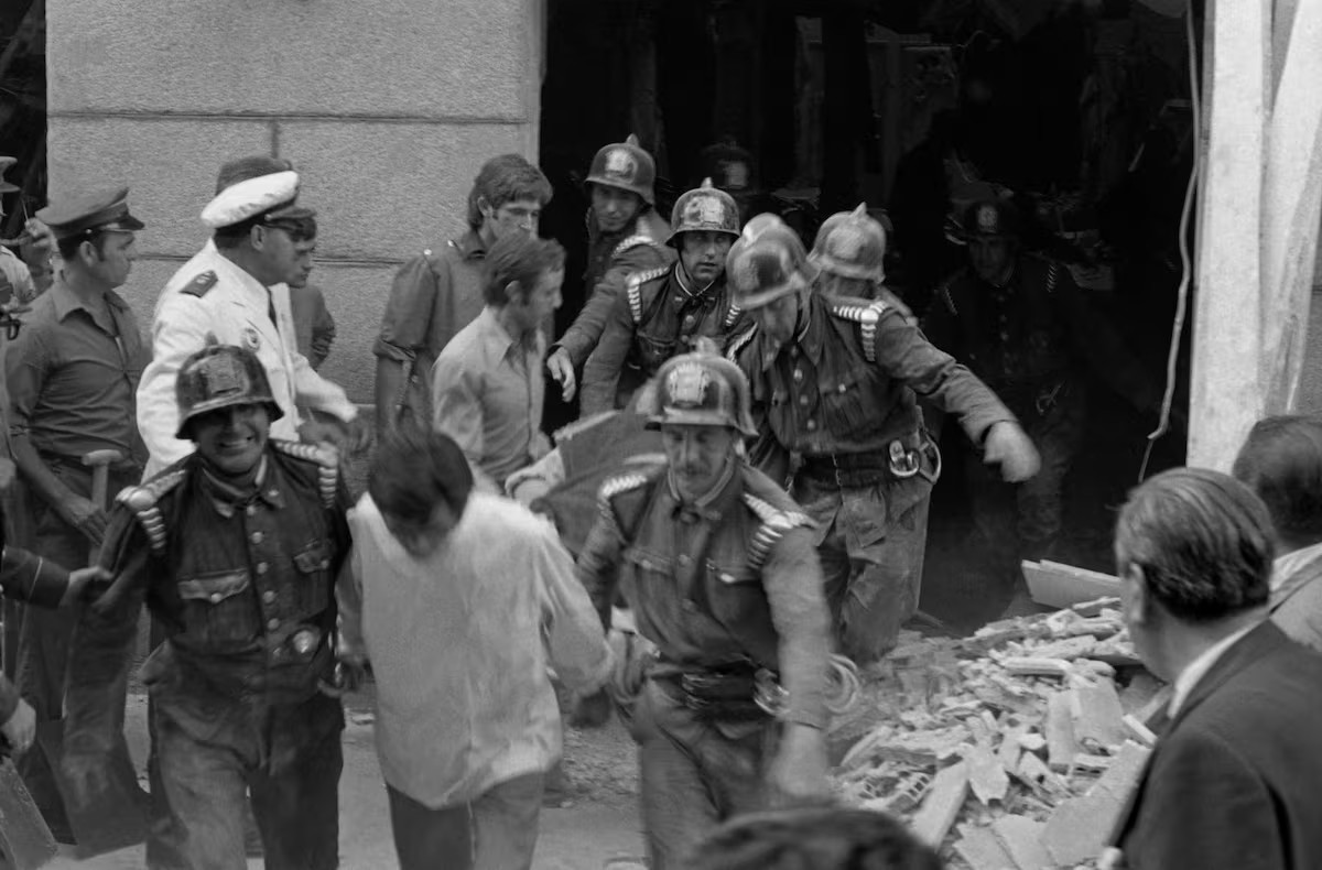 Los miembros del cuerpo de Bomberos de Madrid evacuan a las víctimas del atentado de ETA en la calle del Correo, en Madrid, el 13 de septiembre de 1974. VOLKHART MÜLLER (EFE)