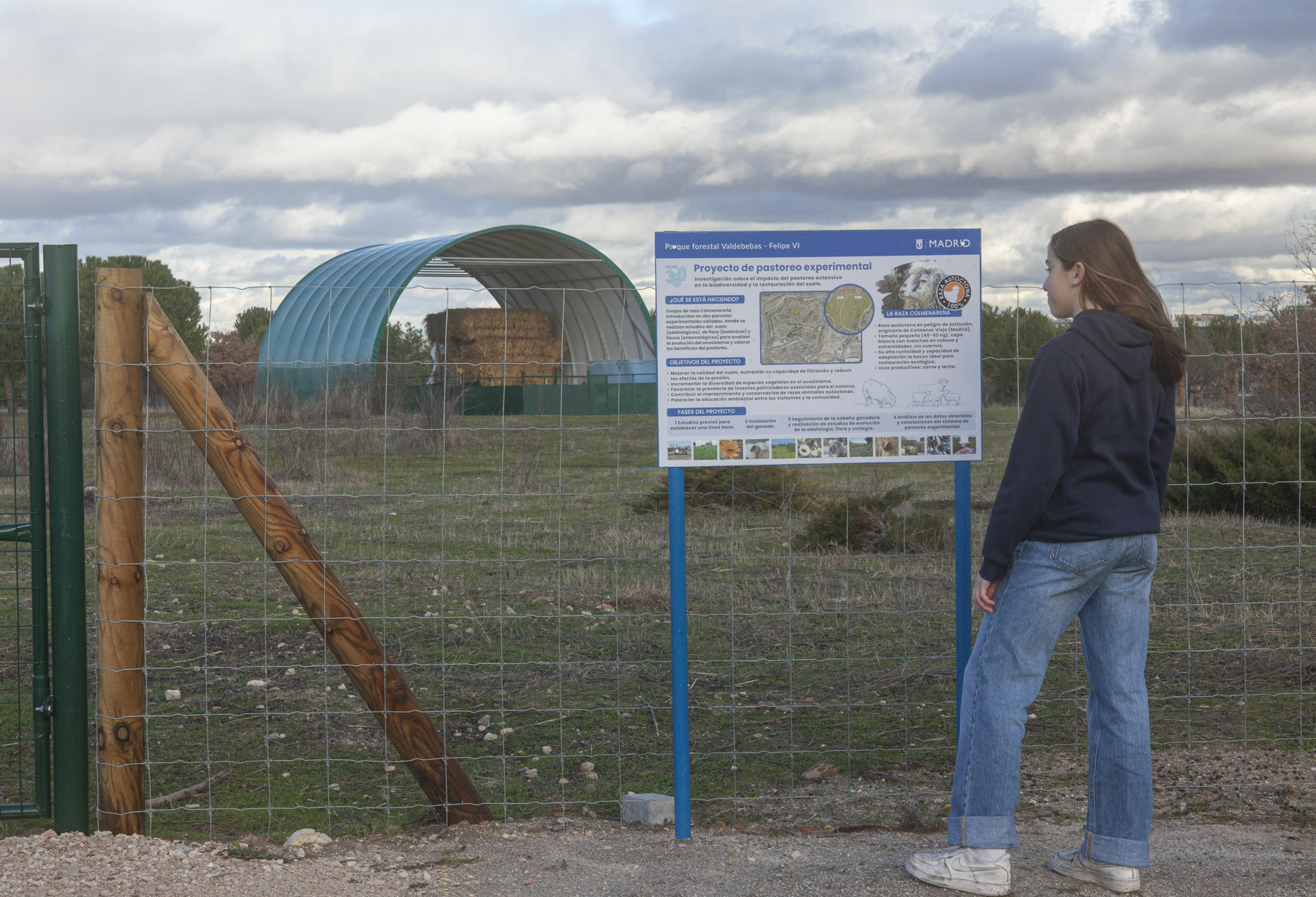Al acercarse al cercado, un gran cartel explicativo informa detalladamente de un proyecto experimental, impulsado por el Ayuntamiento de Madrid, sobre el aprovechamiento del pastoreo controlado. El objetivo es evaluar los efectos del rebaño sobre los suelos y la fauna de la zona. Para ello, se han instalado en la parte noroeste del parque varios cercados con 15 ovejas de la raza colmenareña (autóctonas del municipio madrileño de Colmenar Viejo) que irán rotando por diferentes parcelas para compararlas con una no pastoreada, que funcionará como control.