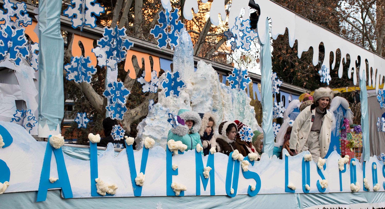 Los Reyes Magos se repartieron en tres carrozas diferentes: Melchor en la que preparó la asociación vecinal Las Cárcavas-San Antonio, Gaspar montado en un ‘camello’ sobre la que la Parroquia Cristo Salvador recreaba un belén viviente y Baltasar en la carroza ‘helada’ que prepararon las asociaciones Jóvenes del Parque y Danos Tiempo con un mensaje de concienciación sobre el calentamiento global: ‘Salvemos los polos’.