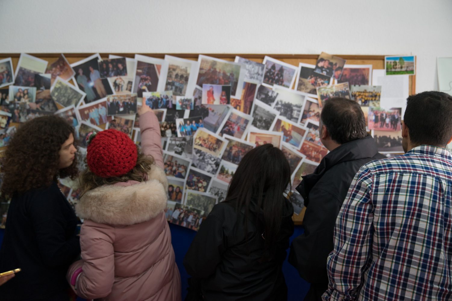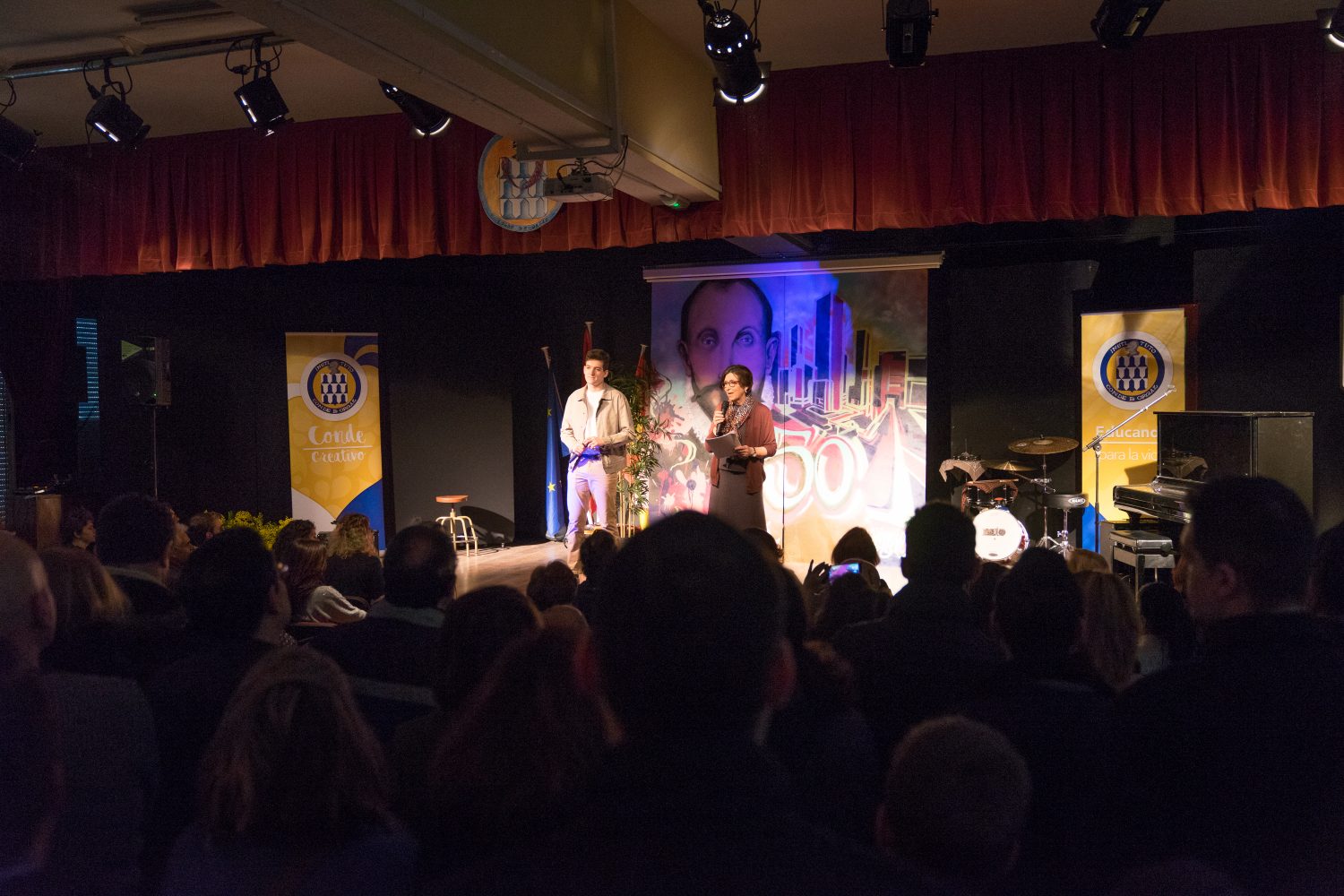 Más de 700 personas intentaban reconocerse en las fotos que empapelaban los pasillos mientras que en el escenario del salón de actos -al que una gran parte no pudo acceder-, se representaba una historia abreviada y divertida del centro que era el reflejo de la historia de nuestro país.